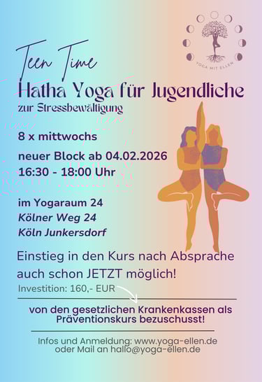 Jugendliche sind immer häufiger mit Stress konfrontiert – sei es durch schulische Anforderungen, soziale Medien oder den Druck, immer „online“ zu sein. In meinem Kurs für Jugendliche vermittle ich einfache, aber effektive Techniken, um Stress abzubauen, die innere Ruhe zu stärken und dabei in Kontakt mit ihrem wahren Selbst zu bleiben. Der Fokus liegt darauf, jungen Menschen Werkzeuge an die Hand zu geben, mit denen sie gelassener und aufrechter (!) durch den Alltag gehen und ihre eigene Authentizität bewahren können. Wir üben in einer lockeren Atmosphäre, mit Musik und Möglichkeiten zum Austausch untereinander. Die Kursblöcke von 8 x 90 Minuten (1 x pro Woche) finden in der Regel zwischen den Ferien statt, also z.B. Start nach den Herbstferien, Ende vor den Weihnachtsferien.